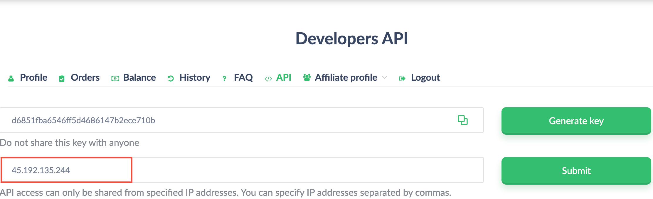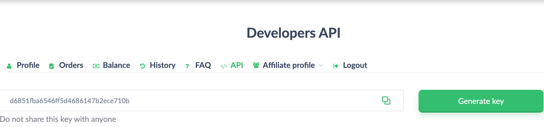 You can generate a new API key from [`your dashboard`](https://proxy-seller.com/personal/api/) at any time. Simply press the 'Generate key' button.